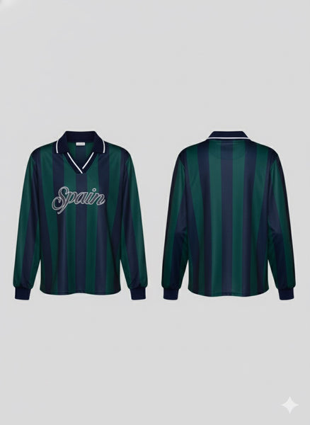 The green and navy stripe combo pairs perfectly with the bold SPAIN lettering for a clean, stylish, athletic look.